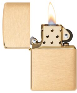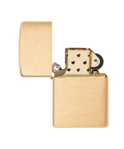 - Bật lửa vỏ dày màu đồng vàng đánh vân xước ngang hai mặt Zippo, mang phong cách cổ điển, mộc đáy con dấu đặc trưng đóng dấu chữ A và ngọn lửa – dấu chứng thực để phân biệt dành cho zippo dòng vỏ Armor so với dòng tiêu chuẩn 1,5 lần.