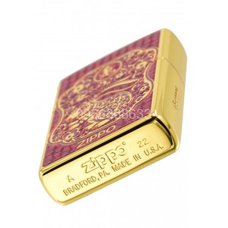 • Cả hai bề mặt đều được thiết kế trang trí công nghệ chạm khắc Laser phức tạp và công nghệ hình ảnh đặc biệt tạo nên lớp khảm in đầy đủ màu sắc, với lớp mạ vàng dày (Gold Plating) và có độ bóng cao. Hình ảnh chú Thỏ khảm đỏ trên nền Zippo mạ vàng sẽ mang đến cho bạn sự may mắn, hạnh phúc và phú quý